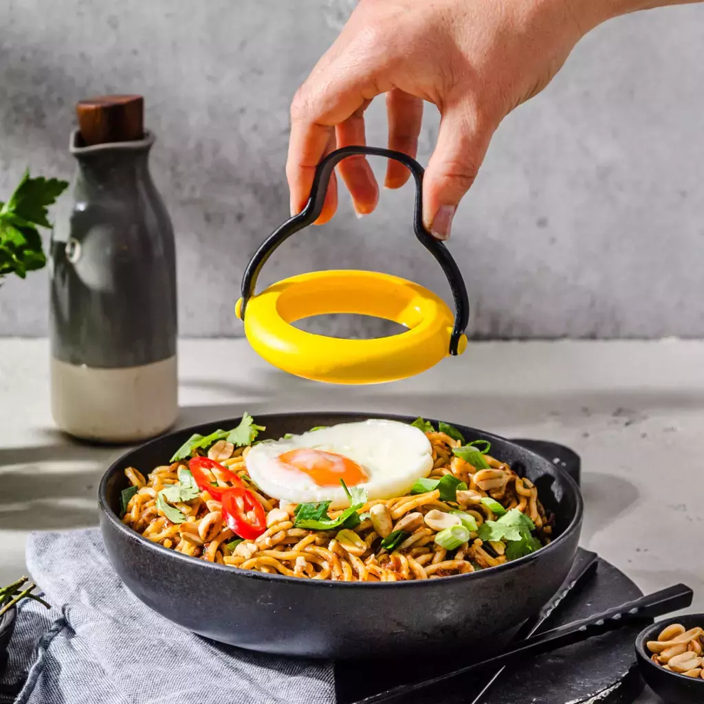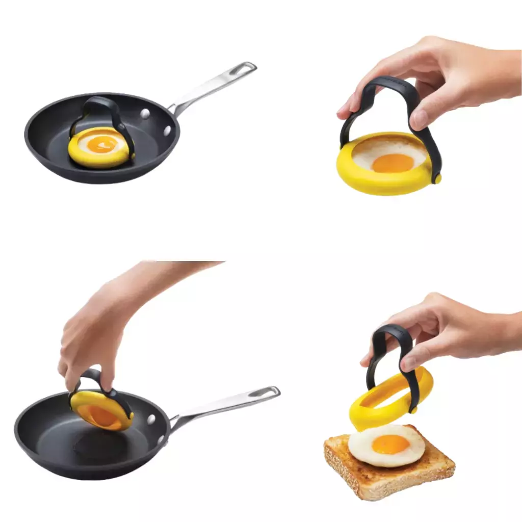 - Una vez cocido, el mismo anillo sostiene el huevo, permitiéndote voltearlo, levantarlo y servirlo de manera impecable.